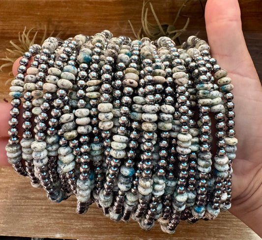Sterling Silver Spiderweb Kingman Turquoise & Ponca Pearl Memory Wire Bracelet – Fits Up to 9” Wrist – Artist Jason Ogg