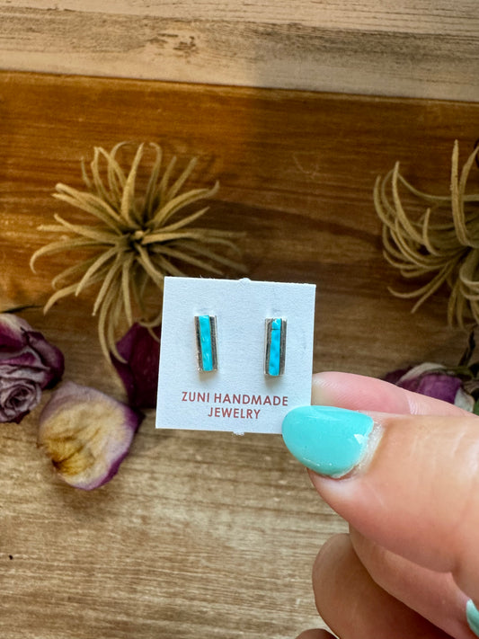 Mini Rectangle Stud Earrings – Kingman Turquoise – Sterling Silver – Zuni Made