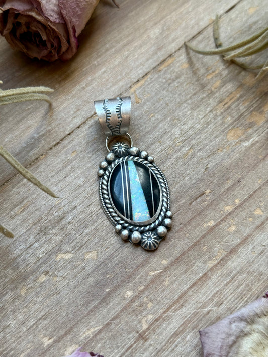 Sterling Silver Black Micarta & Lab Opal Inlay Pendant – Handmade by Artist Shay Pfeiffer