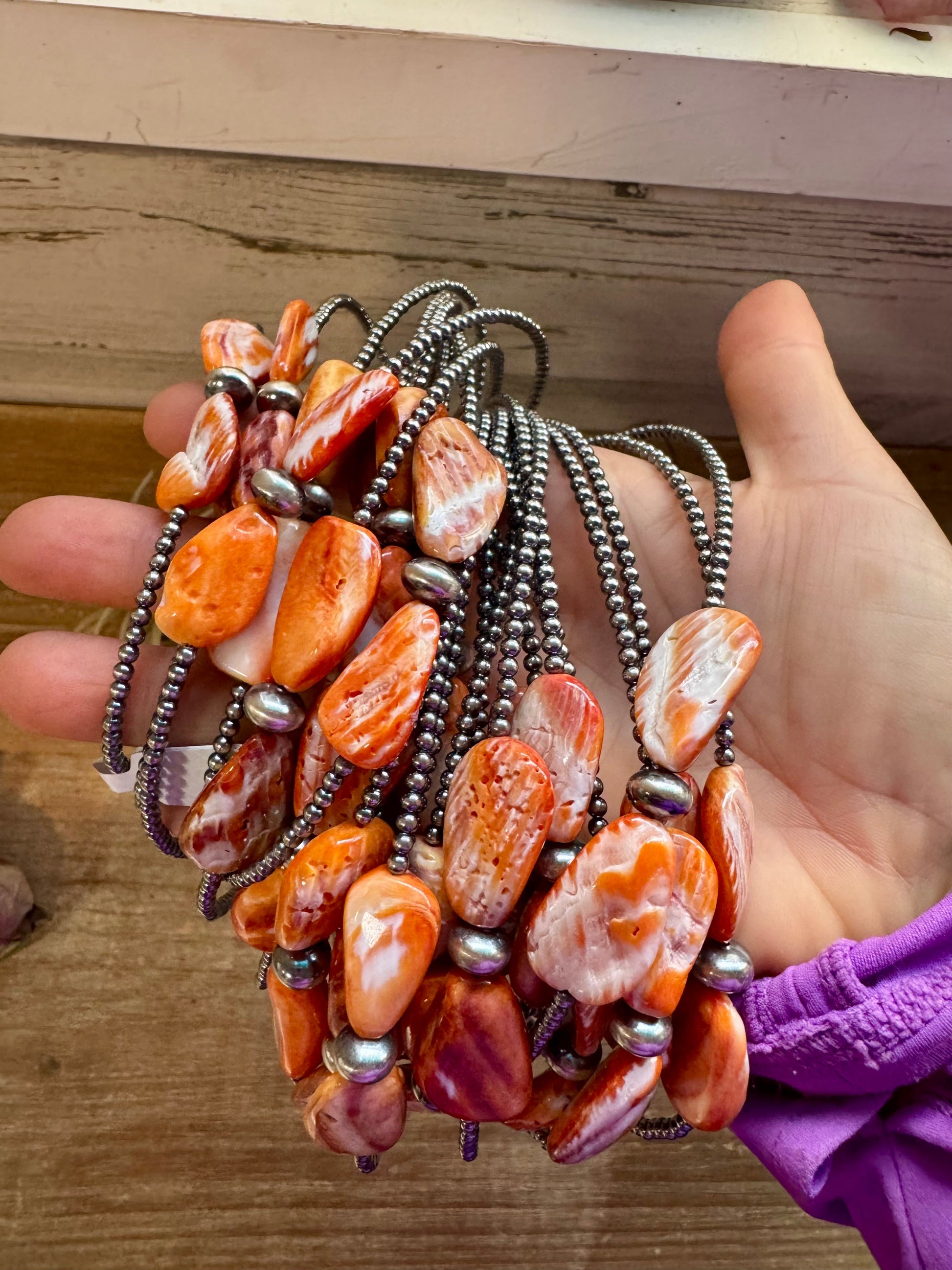 Handmade in the USA by The Bijoux FAB, this elegant choker is crafted with 3mm sterling silver pearls and features a striking 10mm sterling silver center pearl. On each side of the centerpiece are three spiny oyster beads, showcasing warm orange tones and natural variations in color and shape — making every necklace one of a kind. Finished with a sterling silver clasp, chain, and 2-inch extender, this piece is simple yet full of personality.