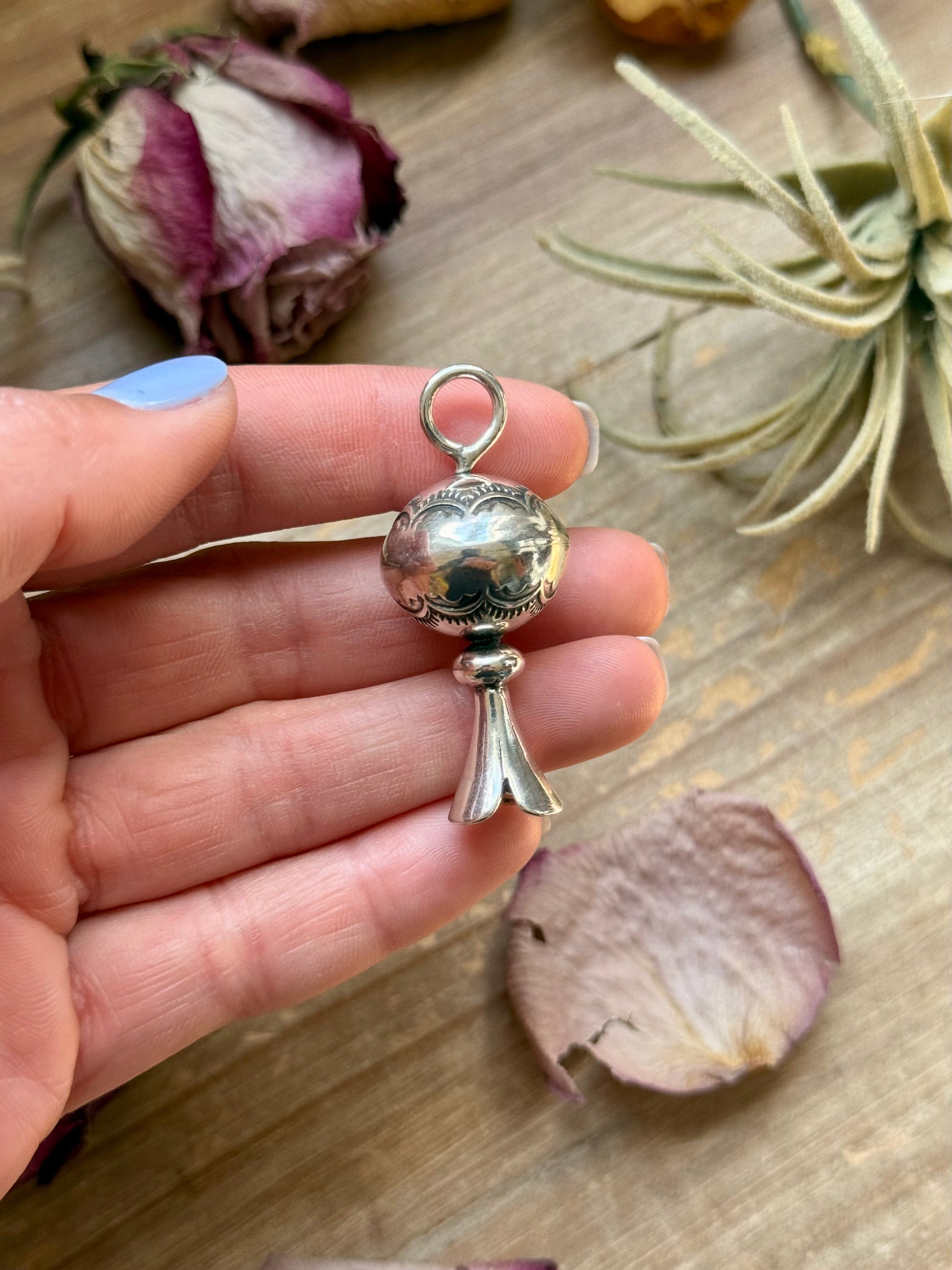 Crafted by artist Jason Ogg, this hand-milled sterling silver mini blossom pendant features a stunning fancy sun ray stamp design. Each pendant is individually made in the USA using traditional silversmithing techniques, showcasing exceptional attention to detail. The bail is designed to fit up to 6mm beads, making it perfect to pair with your favorite sterling silver or turquoise strand.