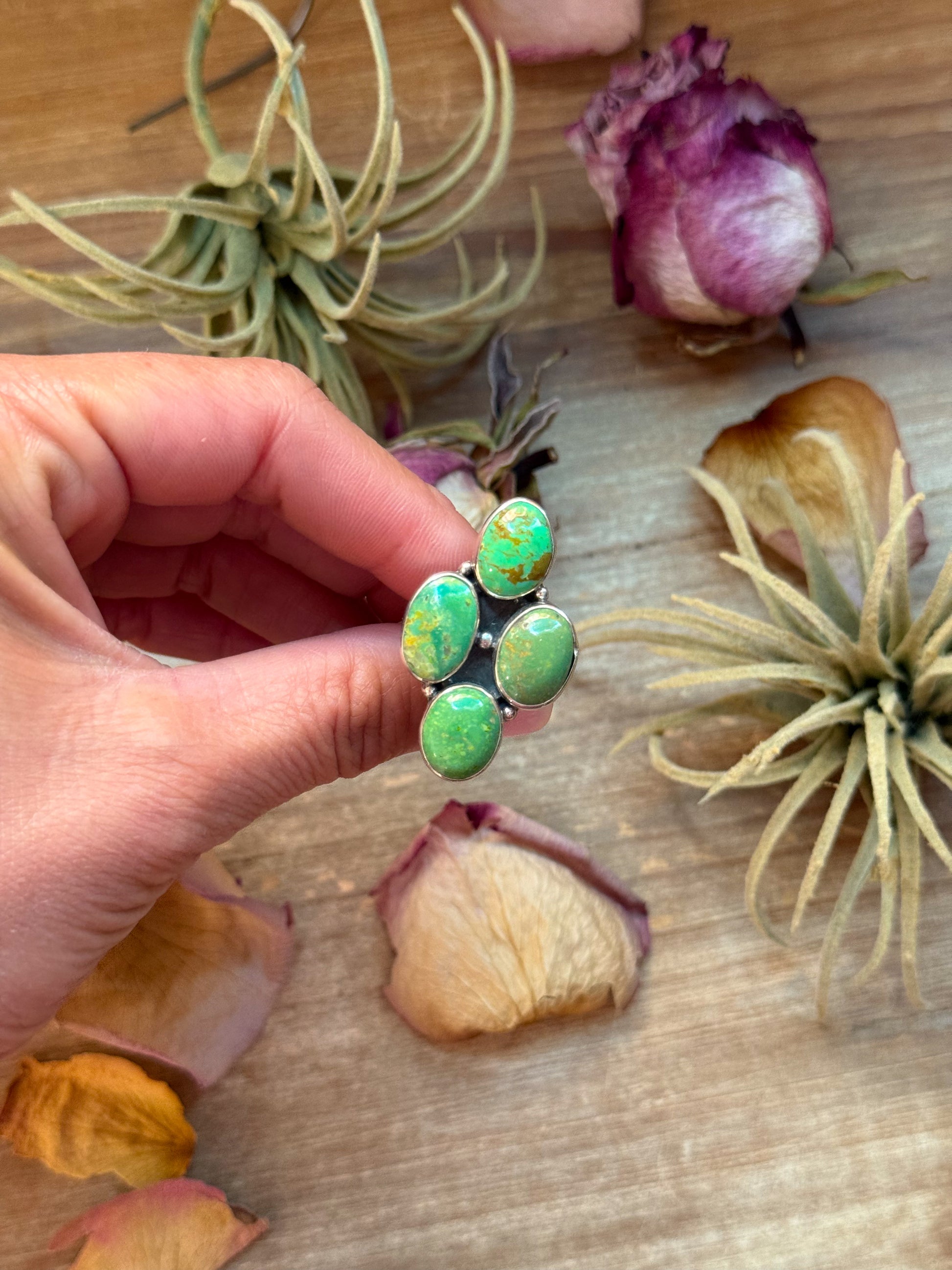 Handmade in the USA, this green turquoise ring features four beautiful stones arranged in a bold diamond-shaped design. The deep green hues and natural matrix give this piece a rich, earthy character that captures the essence of true Southwestern style.
