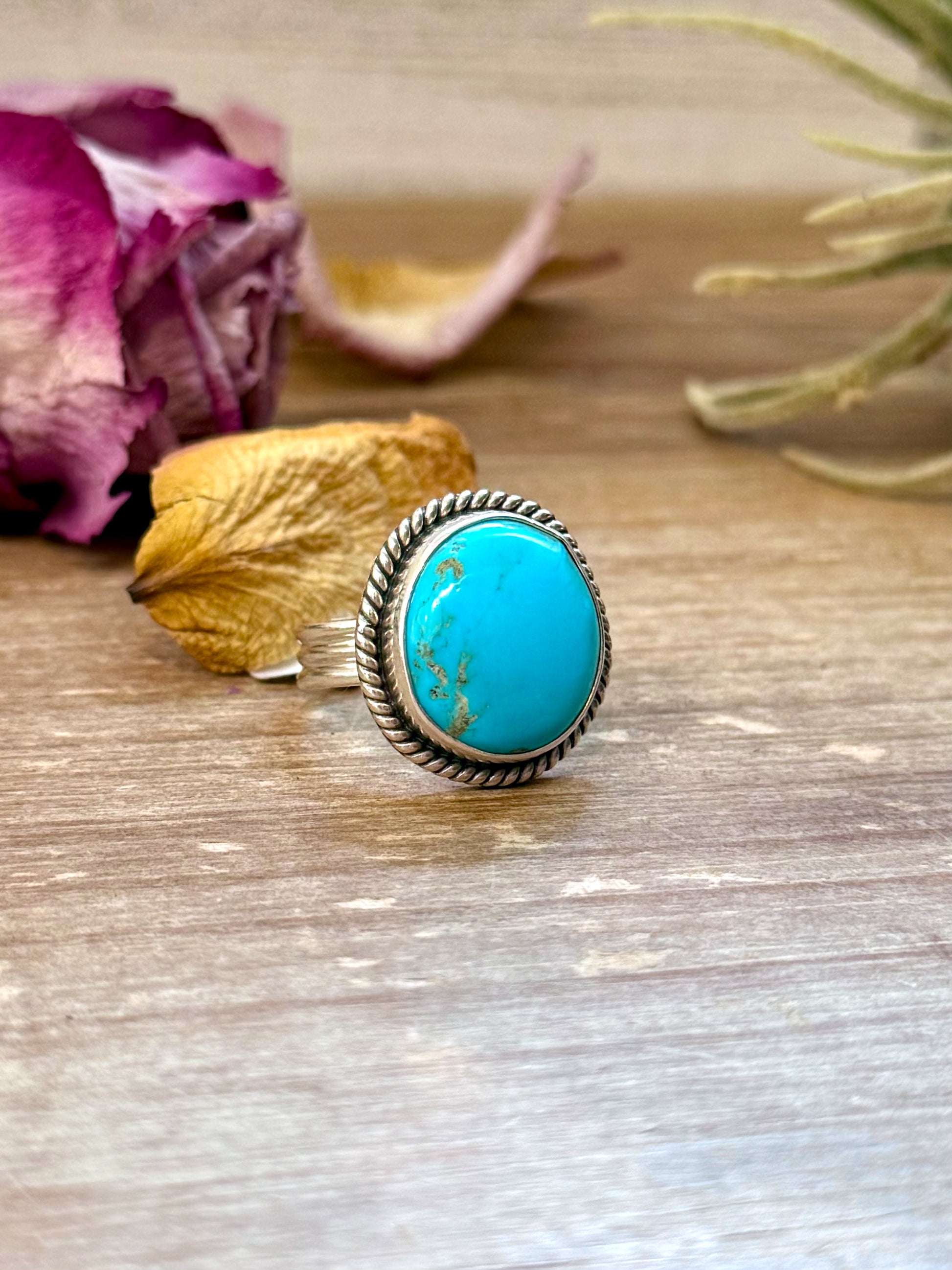 Each ring is one-of-a-kind, with unique variations in turquoise color and pattern. Beautifully proportioned for smaller hands, this size 6 design delivers a refined pop of Western turquoise style — perfect for everyday wear or pairing with your statement pieces.