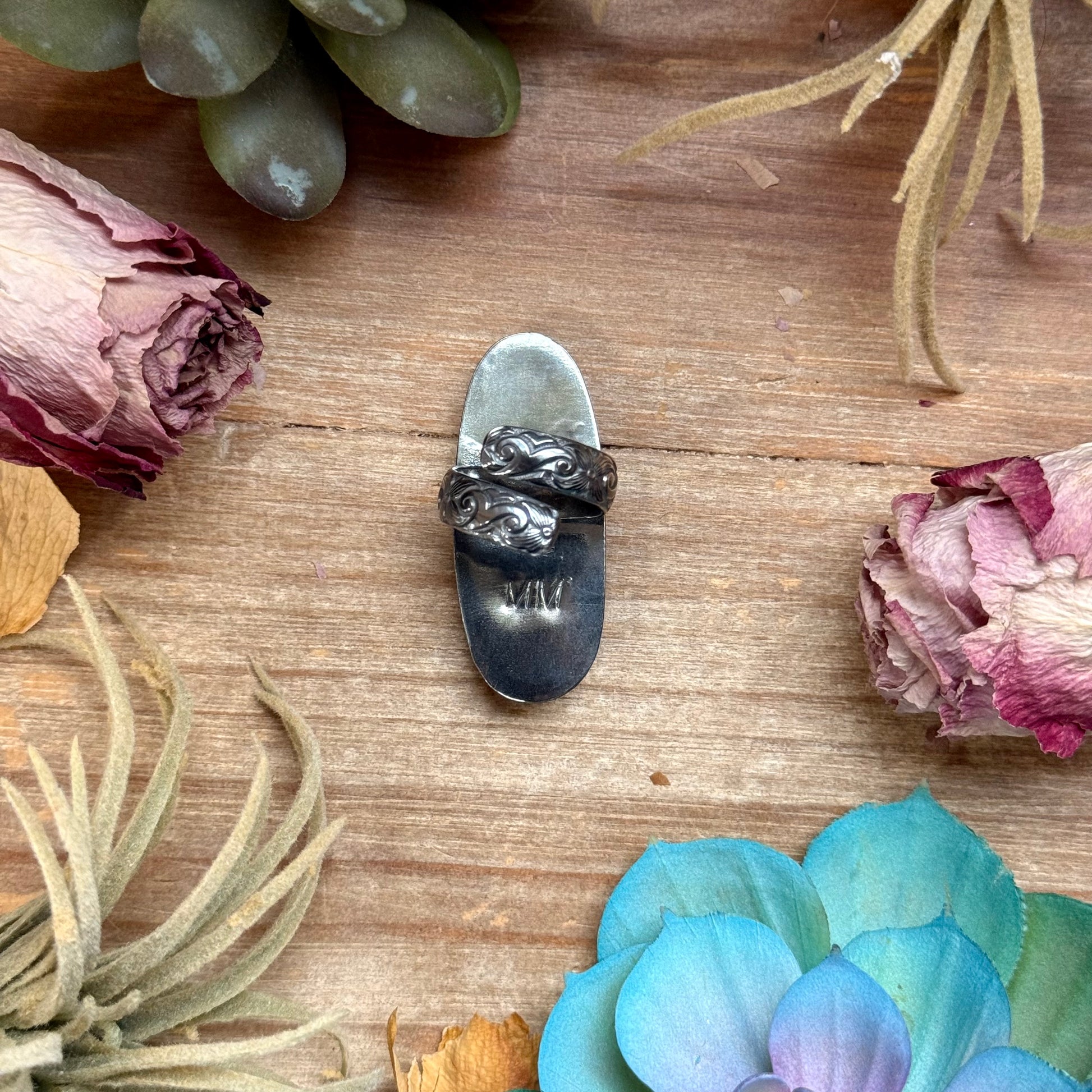 This bold statement ring is handcrafted in-house by MJ using traditional silversmith work and features a long turquoise stone with rich brown tones set in solid sterling silver. Designed with an adjustable band for a comfortable fit, this piece measures approximately almost 2 inches long by a little bit under 1 inch wide, creating a striking and unique design.