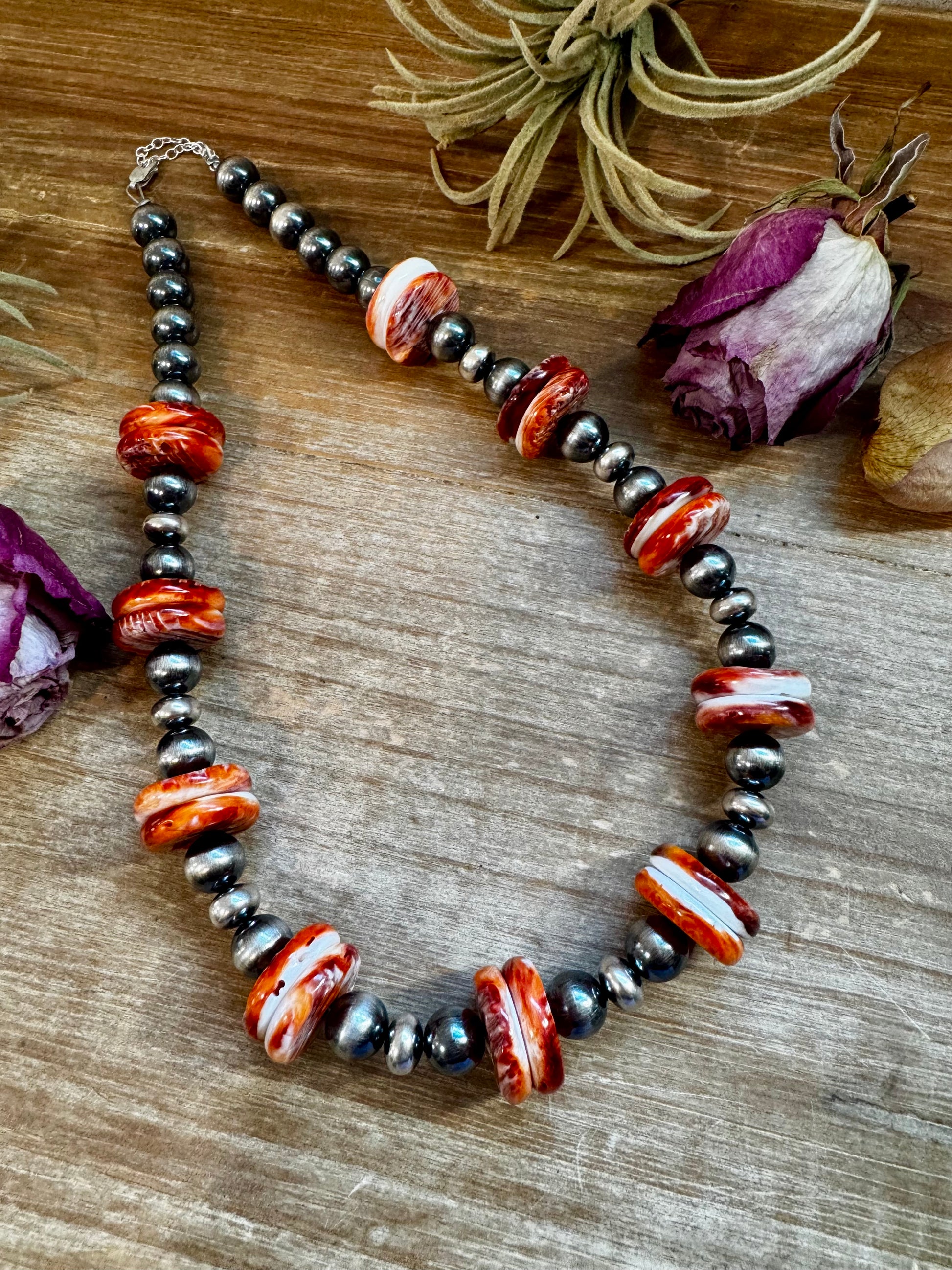NFR Collection Necklace – 10mm Sterling Silver Pearls with 20mm Red Spiny Oyster – Handmade by The Bijoux FAB – 19"