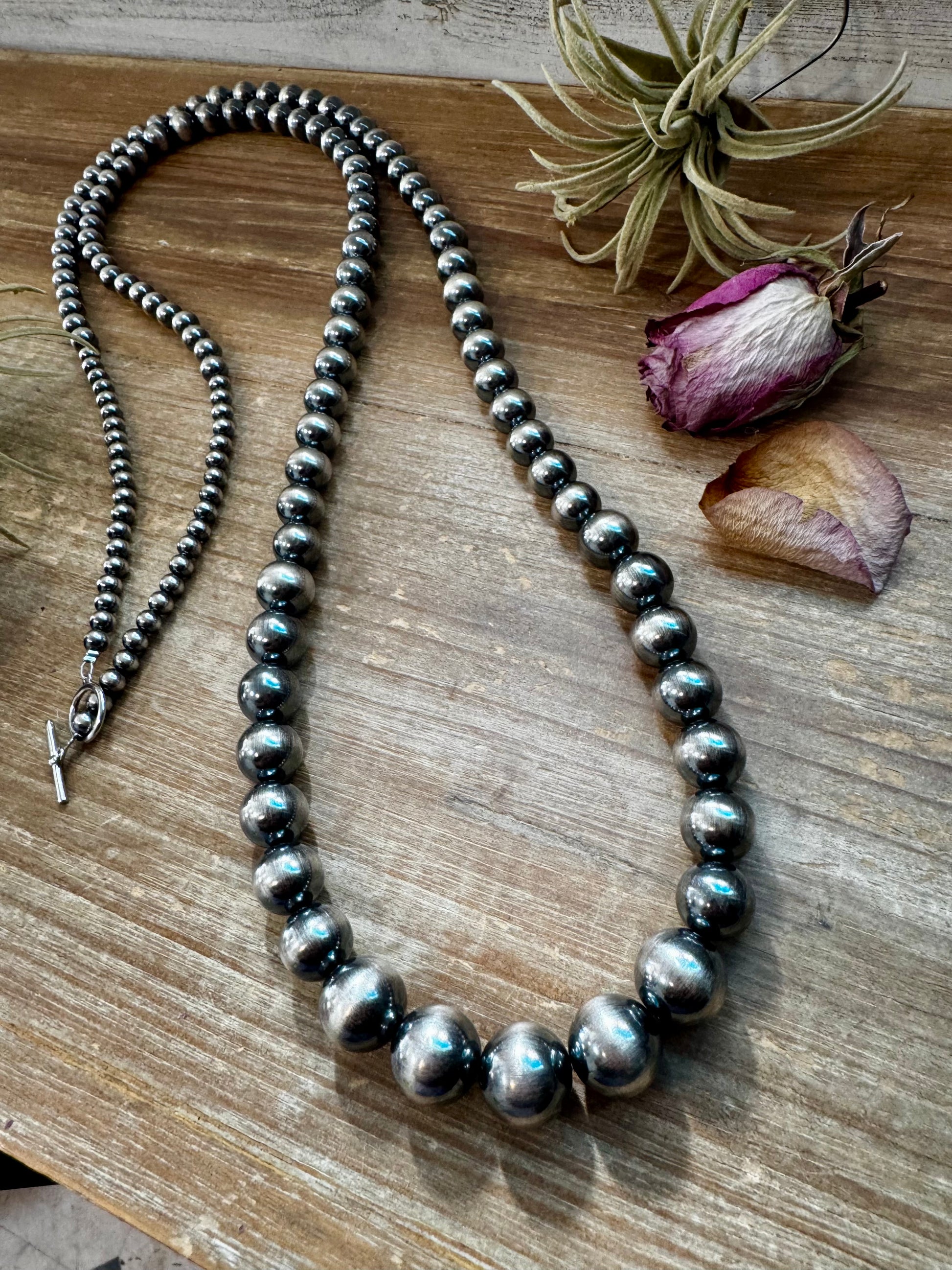From our exclusive NFR Collection, this is the longest and boldest sterling silver pearl necklace ever made by The Bijoux FAB. Measuring an impressive 51 inches long, it features graduated sterling silver pearls ranging from 6mm to 16mm, finished with a non-tarnish hook for effortless wear and shine. Despite its size, the necklace is lightweight and comfortable — perfect for layering, wrapping twice, or wearing long and dramatic.