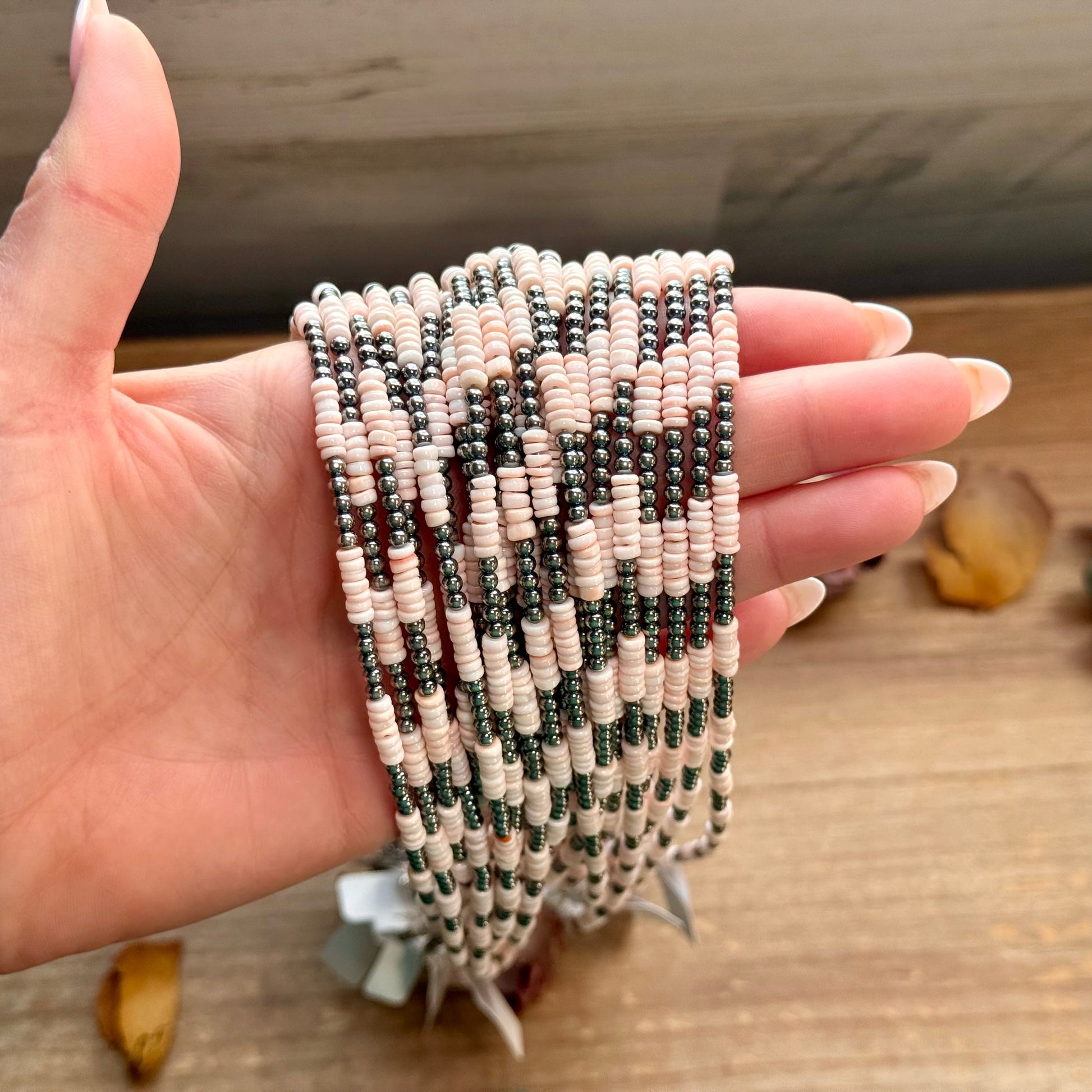 This necklace features pink conch shell heishi beads paired with 3mm sterling silver pearls for a soft, feminine statement. Designed at 20 inches with an extender, it’s perfect for layering or wearing on its own. Each necklace is completely unique due to natural variations in the conch shell. Handmade by The Bijoux FAB and proudly made in the USA.