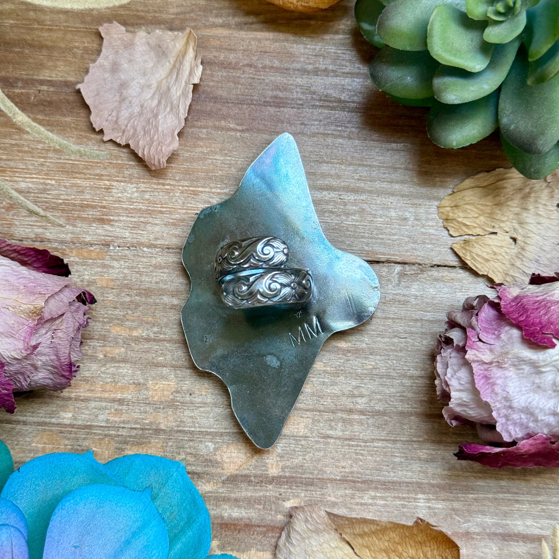 This super fun statement ring is handcrafted in-house by MJ using traditional silversmith work and features a beautiful purple spiny oyster stone set in solid sterling silver. The bold shape makes this ring truly eye-catching while still being comfortable to wear.