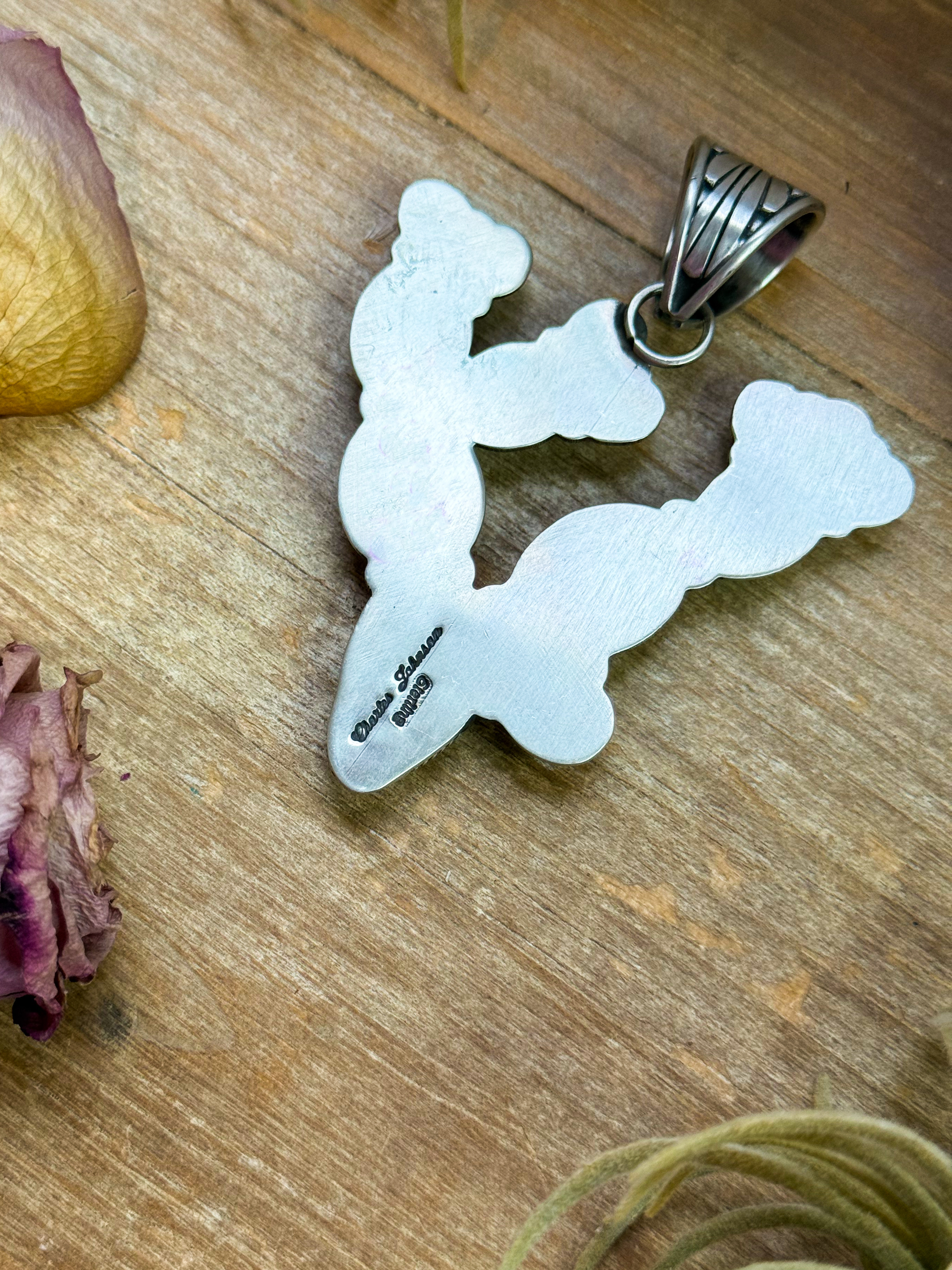 This cactus-shaped pendant is a true statement of Southwestern artistry, Native made by Navajo artist Charles Johnson. Handcrafted in solid sterling silver, it features a stunning combination of Sonoran turquoise and coral stones — each carefully hand-set to highlight its natural color and texture. Measuring just over 3 inches tall and 2½ inches wide, this pendant fits up to a 12 mm pearl necklace or chain. A bold, collectible piece that captures the heart of desert-inspired luxury.