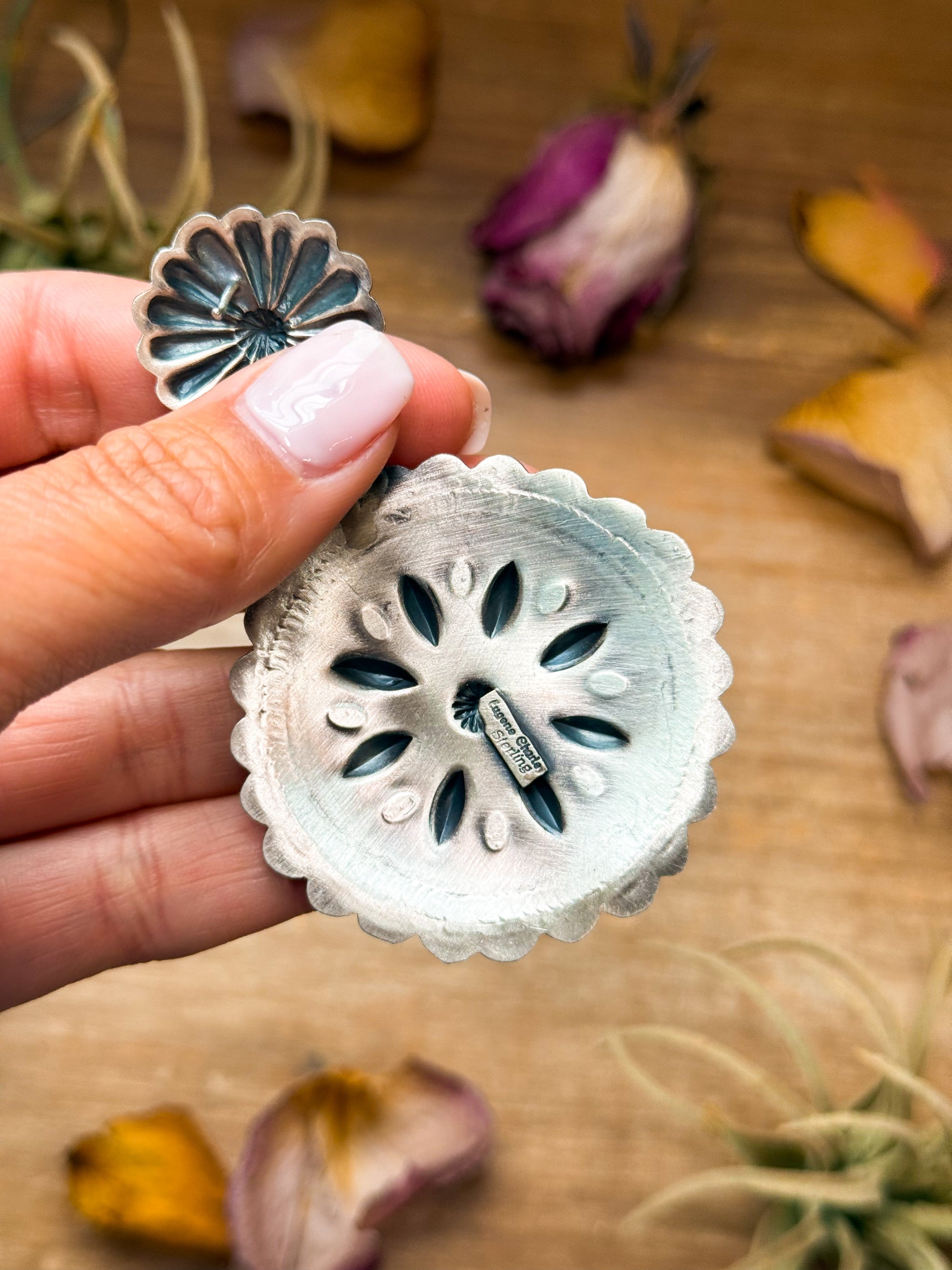 These beautiful sterling silver earrings are Native made by Navajo artist Eugene Charles and feature a stud-on-topwith a second dangle tier for elegant movement and balance. Handcrafted with exceptional detail and stamped “Sterling,” they combine classic Navajo design with a lightweight feel, perfect for both daily wear and special occasions. Each pair reflects the artistry and tradition of authentic Native silversmithing — timeless, graceful, and truly collectible.