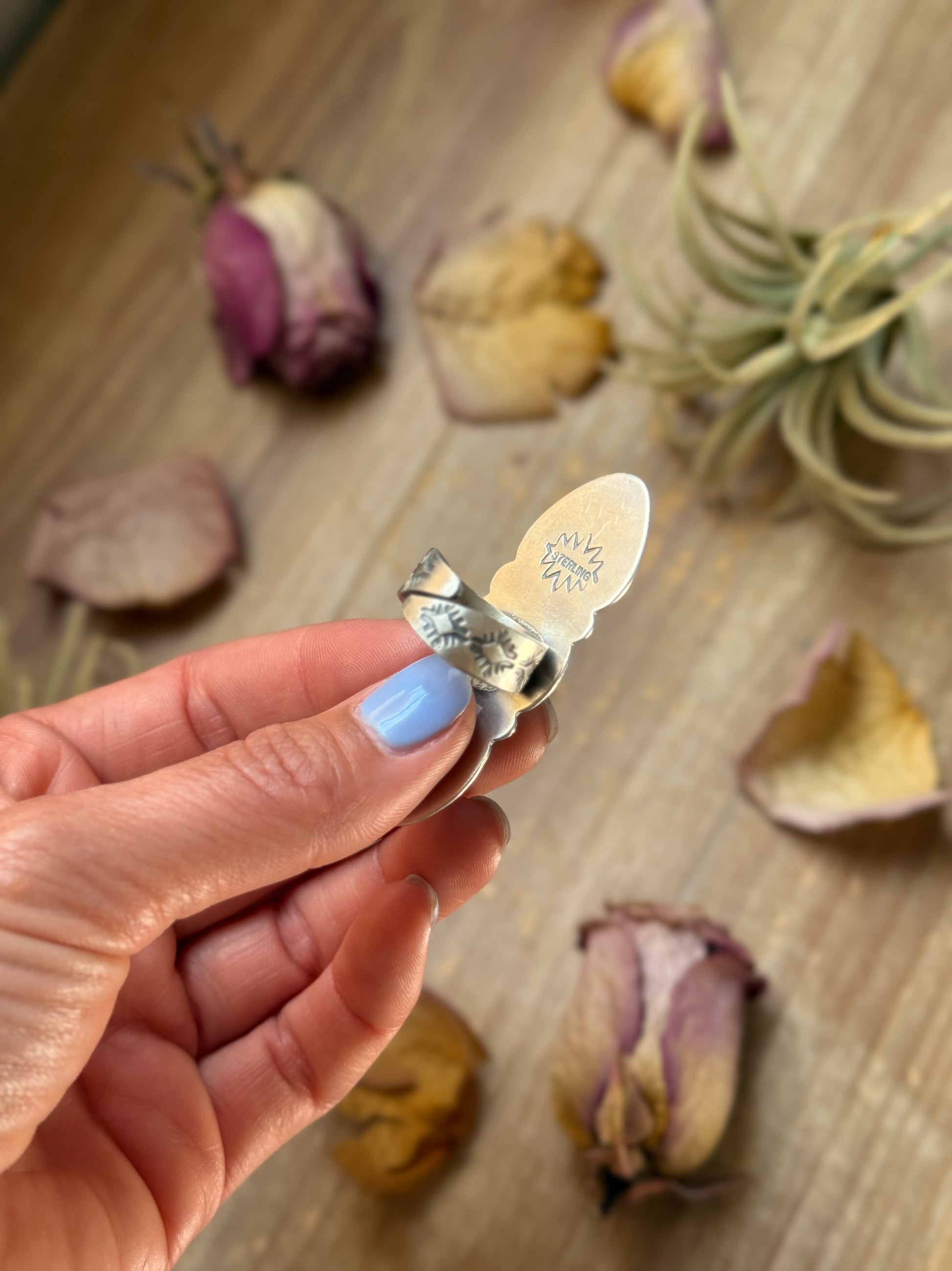 Stamped “Sterling” and created by an unknown Southwestern artist, this ring blends authentic craftsmanship with collectible quality.