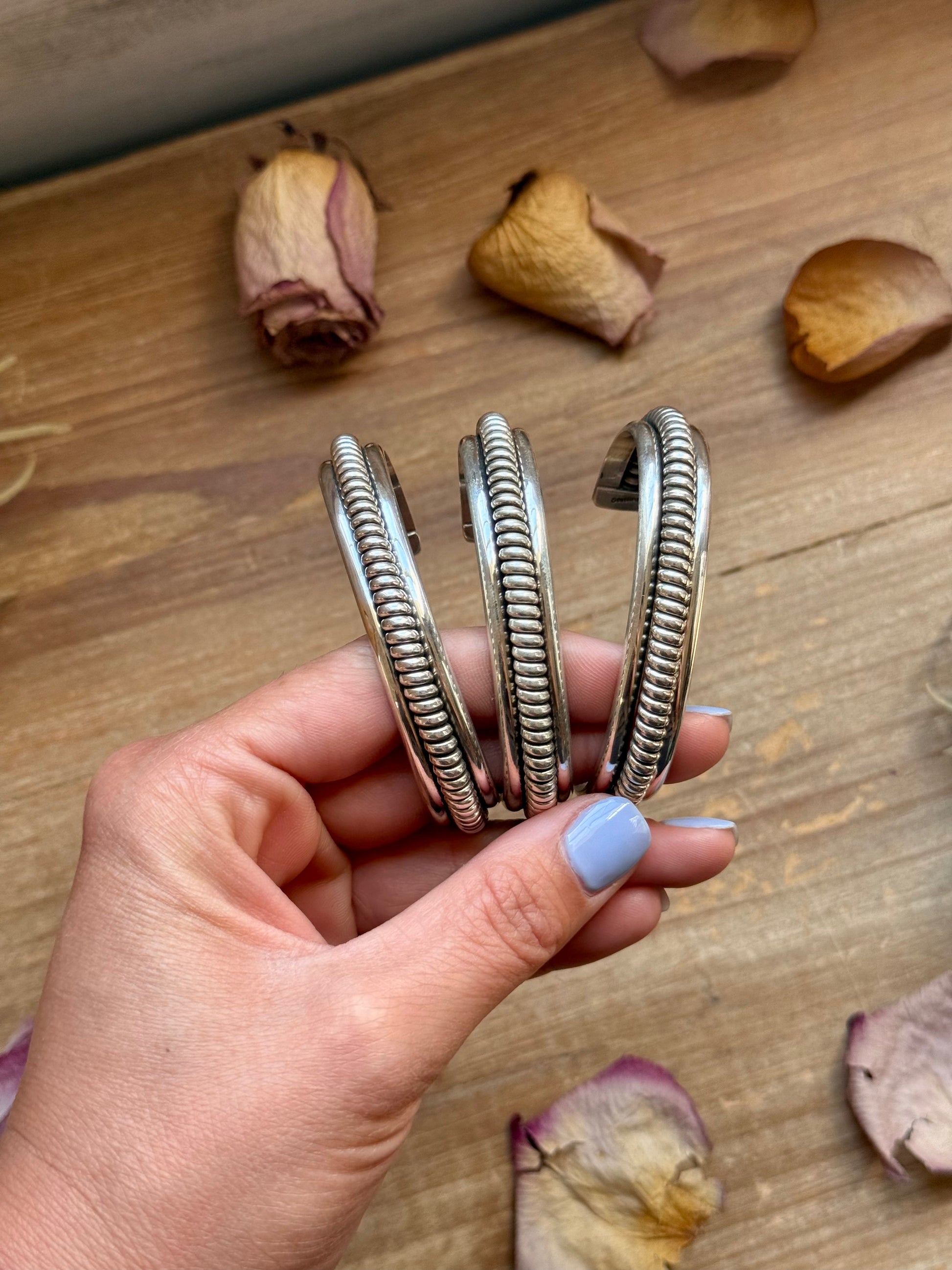This heavy-duty sterling silver cuff bracelet is Native made and built to last, crafted from solid silver with a thick, durable design that still offers a slight natural give for comfort. Though the artist is unknown, it’s a beautifully made piece that fits smaller wrists perfectly and makes the ultimate stacker cuff. Simple, timeless, and full of Southwestern strength — it’s the kind of silver you’ll wear for life.