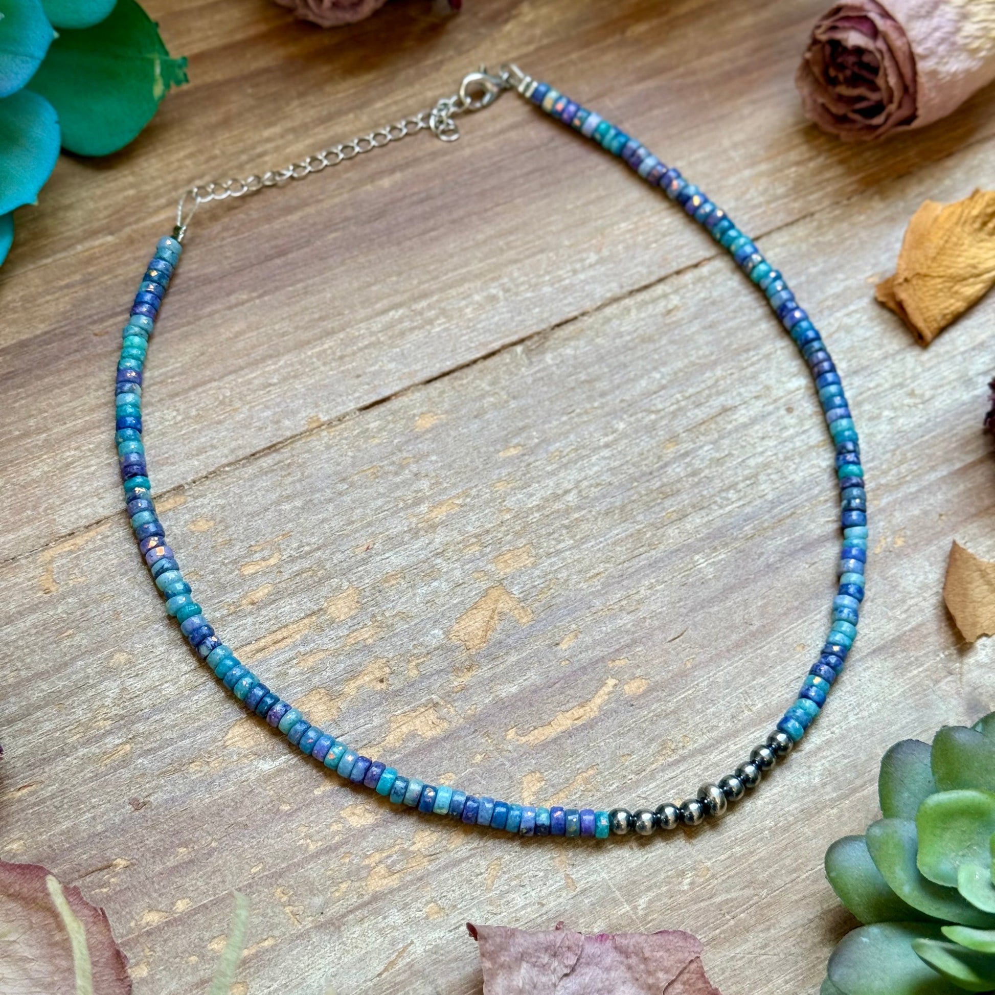 This beautiful 14 inch choker is handcrafted with 4mm sterling silver pearls and saucers, accented with 2x4mm purple dolomite heishi beads. Finished with a 3 inch chain extender and silver plated latch for adjustable and comfortable wear.