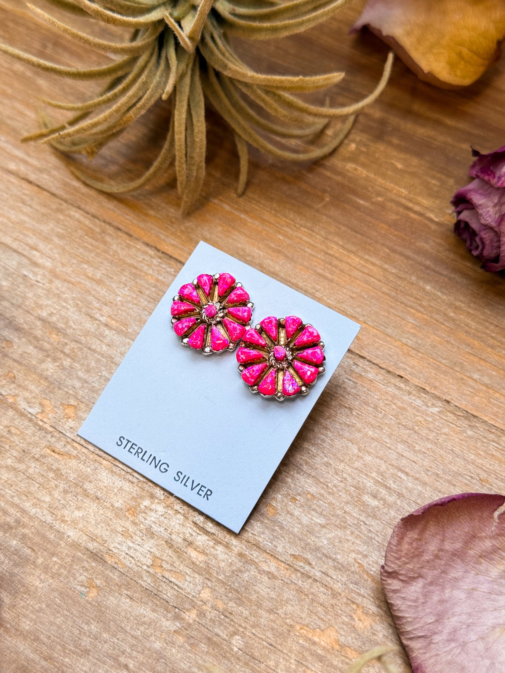 These pink opal cluster earrings are Native made and beautifully handcrafted in sterling silver by artist S.C. Each pair is stamped “S.C.” and “Sterling,” featuring soft pink opal stones arranged in a classic cluster design. The post-in-the-middle setting offers a balanced and comfortable fit. Every pair is unique in color and pattern, making these earrings a one-of-a-kind expression of Southwestern elegance.