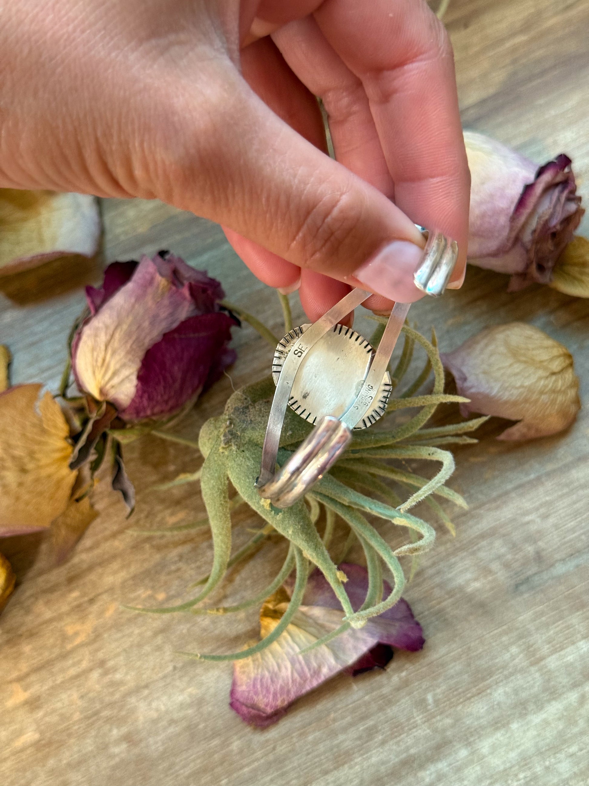 This sterling silver cuff bracelet features genuine turquoise stones with beautiful blue tones and natural matrix details. Stamped “Sterling” and “SE,” this piece is handcrafted with care and designed for comfort — including a slight natural give for easy adjustment. Its small-wrist-friendly fit makes it perfect for everyday wear or layering with your favorite bracelets.