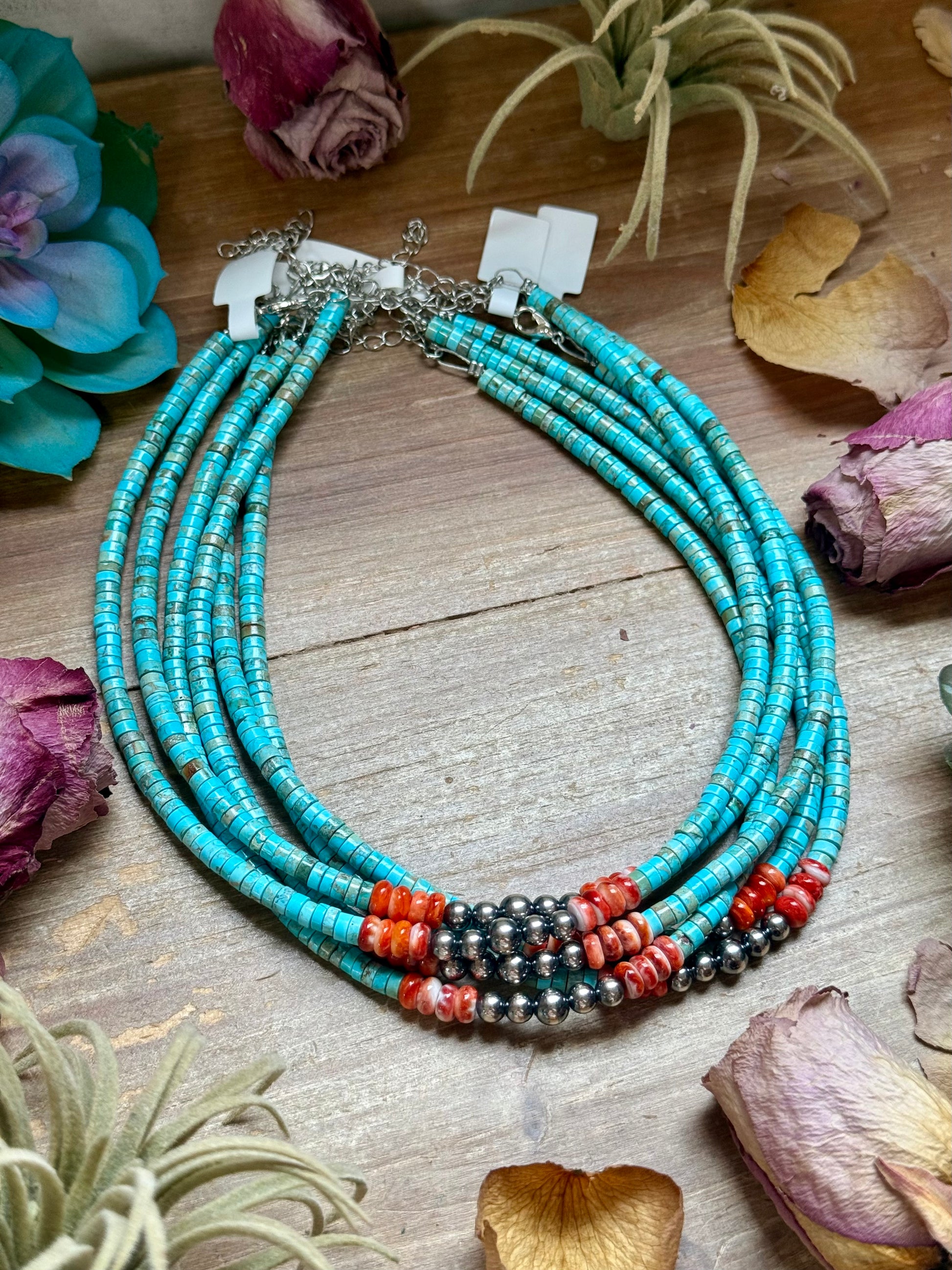 14” Vibrant Choker – Turquoise, Spiny Oyster & Sterling Silver